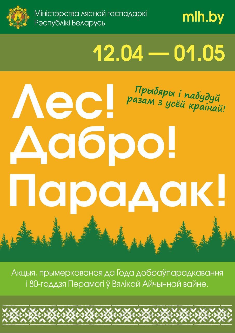 Уже в эту субботу в стране стартует новая кампания - добровольная общественная акция "Лес! Дабро! Парадак!". Символично, что ее старт будет дан в день проведения республиканского субботника, а также в день завершения еще одной акции "Дай лесу новае жыццё!", которая с успехом проходит в эти дни.