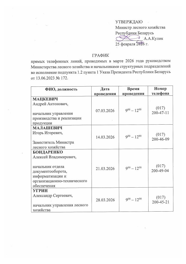 График прямых телефонных линий, проводимых руководством Гродненского ГПЛХО