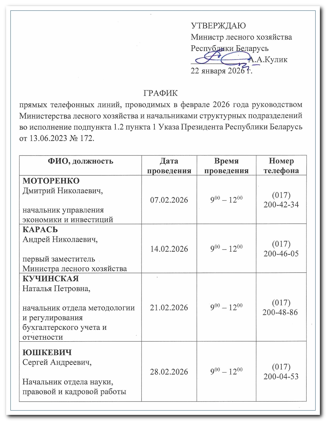 График прямых телефонных линий, проводимых руководством Гродненского ГПЛХО