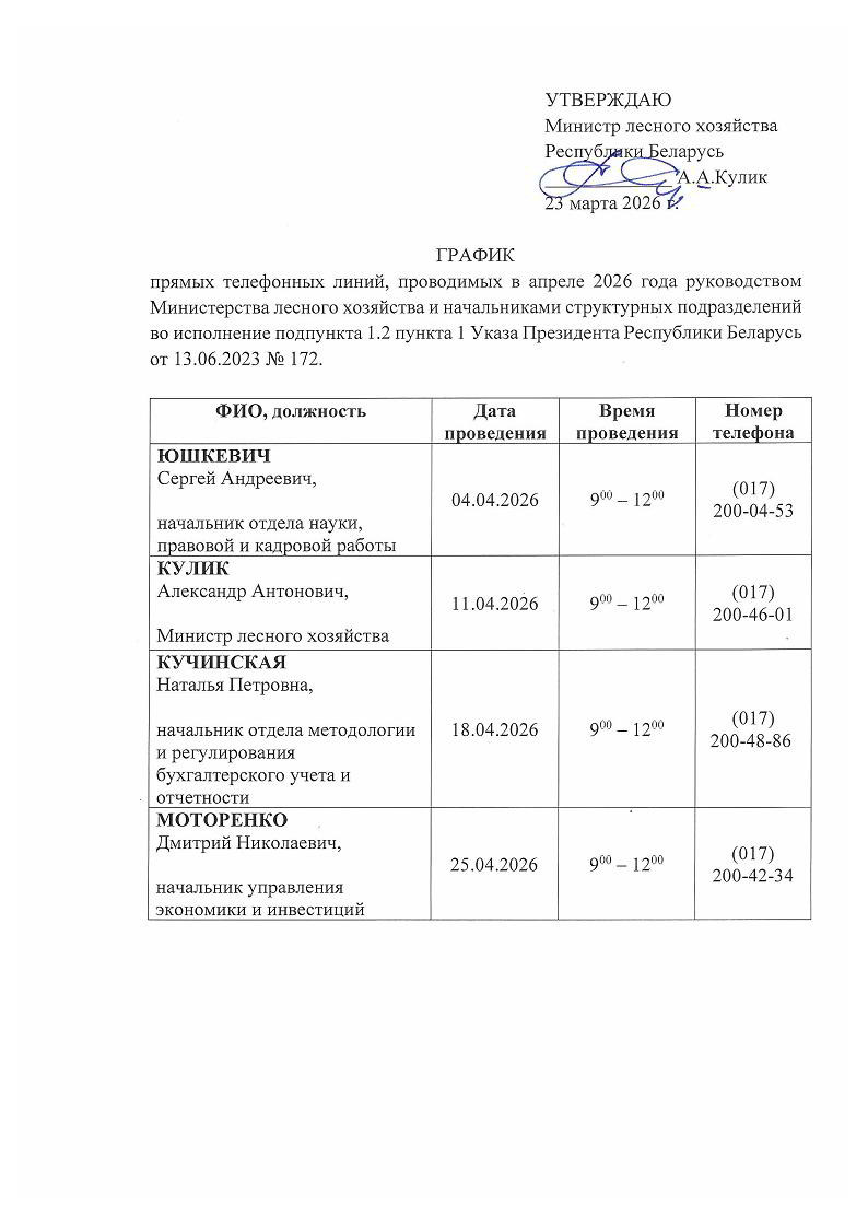 График прямых телефонных линий, проводимых руководством Гродненского ГПЛХО