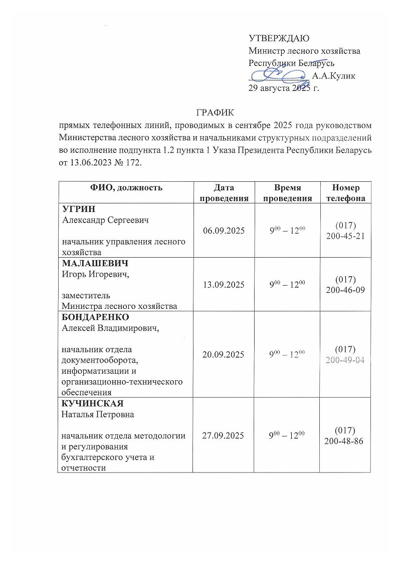 График прямых телефонных линий, проводимых руководством Гродненского ГПЛХО