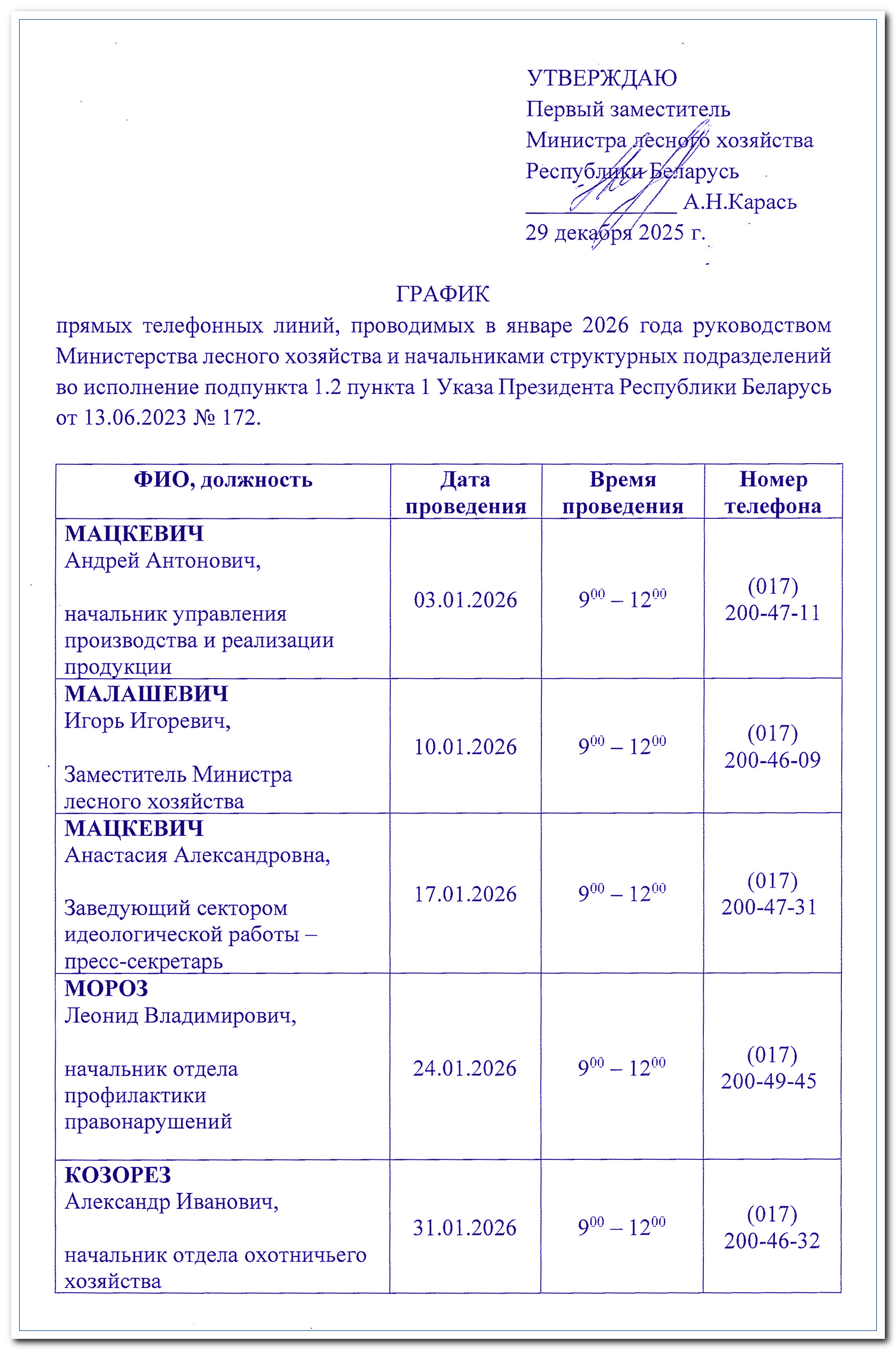 График прямых телефонных линий, проводимых руководством Гродненского ГПЛХО